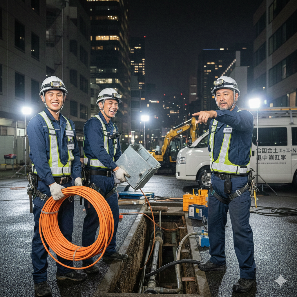 夜間に行うインフラ(電力線)工事の補助がメインです。